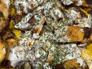 Choice of beef or chicken shawarma layered with garlic sauce